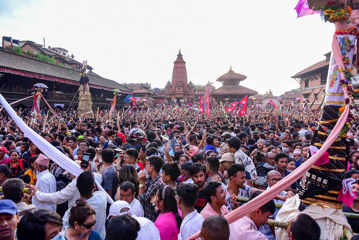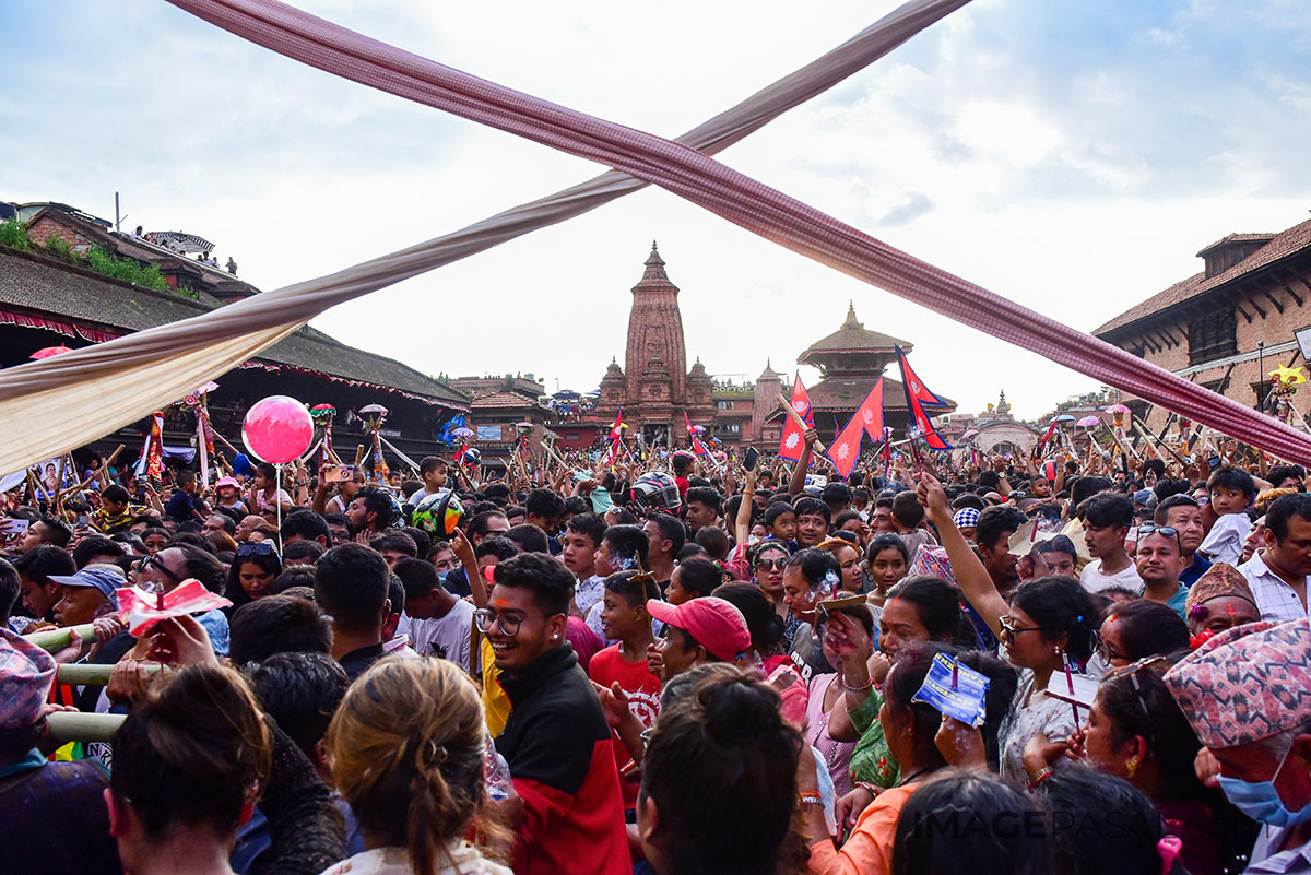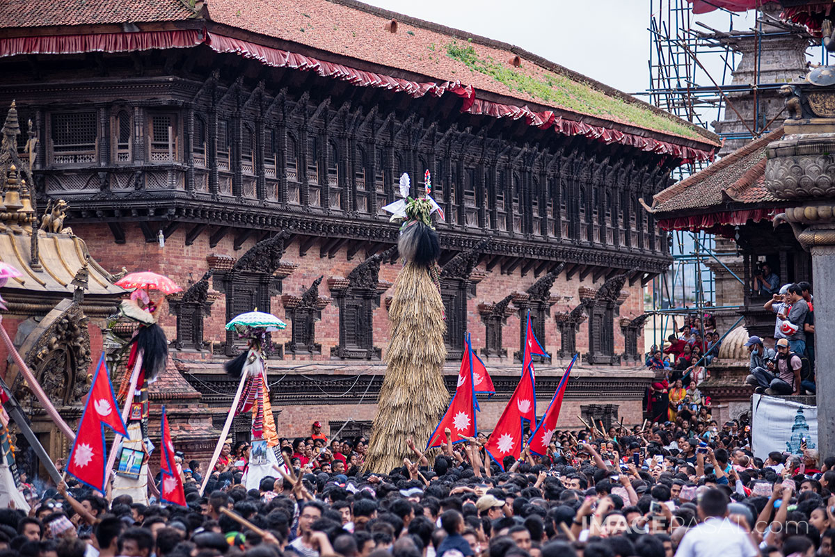 भक्तपुर क्षेत्रमामा वर्षभरीमा दिवंगत भएका आफन्तको सम्झनामा ताहमचा बनाएर तस्वीर टाँसेर भक्तपुर नगर परिक्रमा गर्ने प्रचलन रहेको छ । तस्वीर: चन्द्र चक्रधर (imagepasal.com)