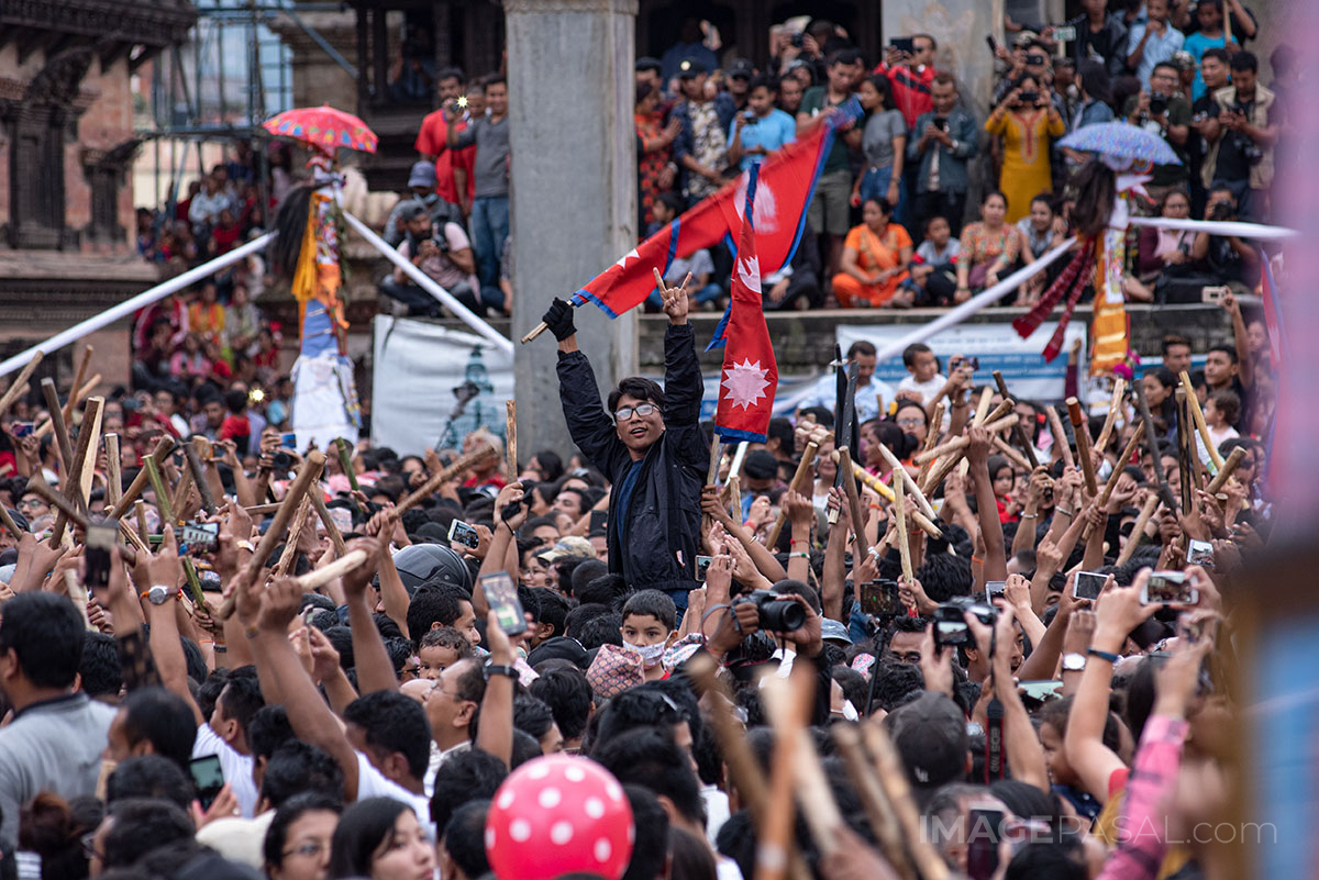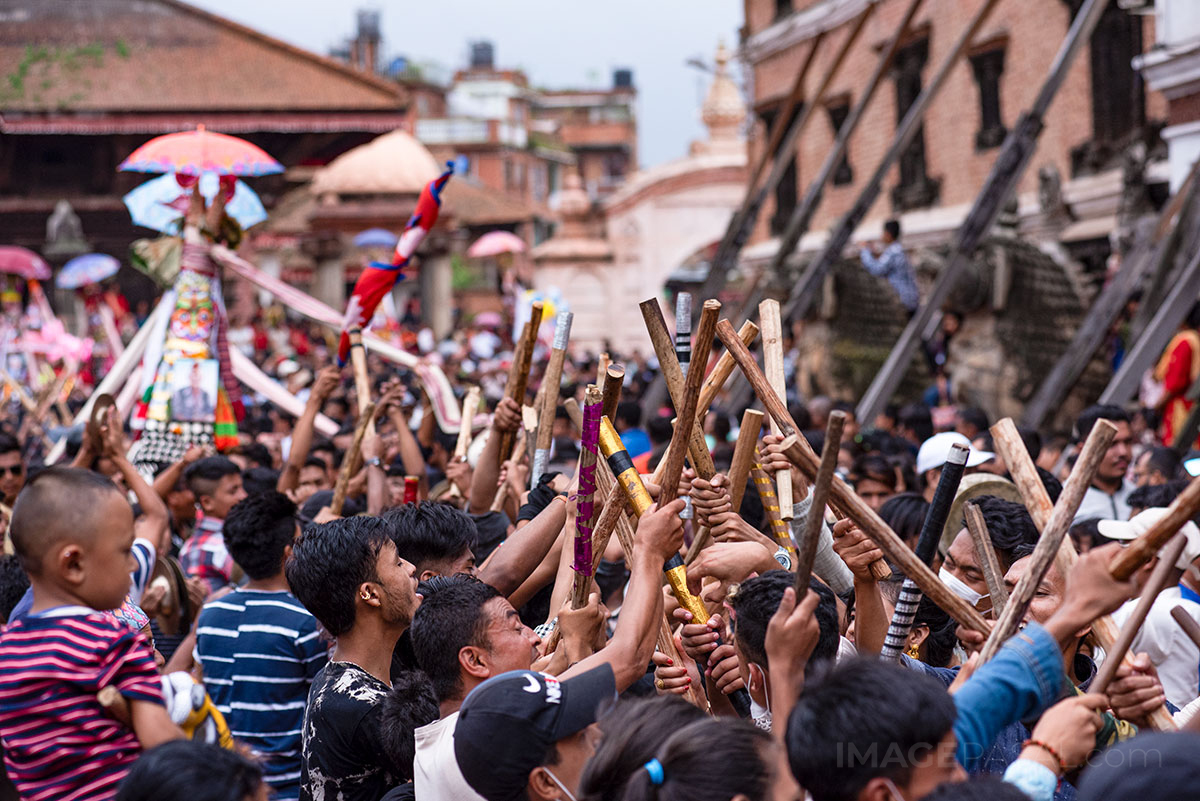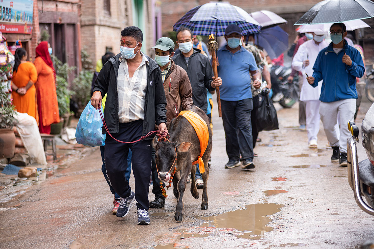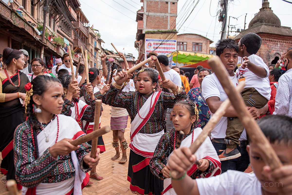 भक्तपुर क्षेत्रमामा वर्षभरीमा दिवंगत भएका आफन्तको सम्झनामा ताहमचा बनाएर तस्वीर टाँसेर भक्तपुर नगर परिक्रमा गर्ने प्रचलन रहेको छ । तस्वीर: चन्द्र चक्रधर (imagepasal.com)